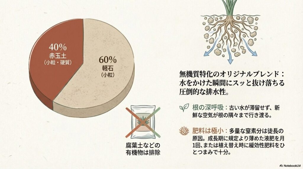 - 用土は水はけを最優先に、肥料は少量・緩効性で十分