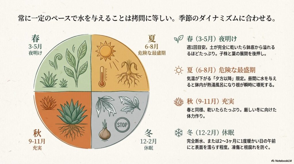 笹の雪の管理において、「水やりを正しく行う」ことは成長速度の維持と健康管理の両方に直結する最重要事項のひとつです。多肉植物全般に言えることですが、笹の雪に関しては特に「乾燥気味に育てる」が鉄則です。ただし、「乾燥気味」の意味をはき違えて完全に断水してしまうと、それはそれで根のダメージに繋がります。
