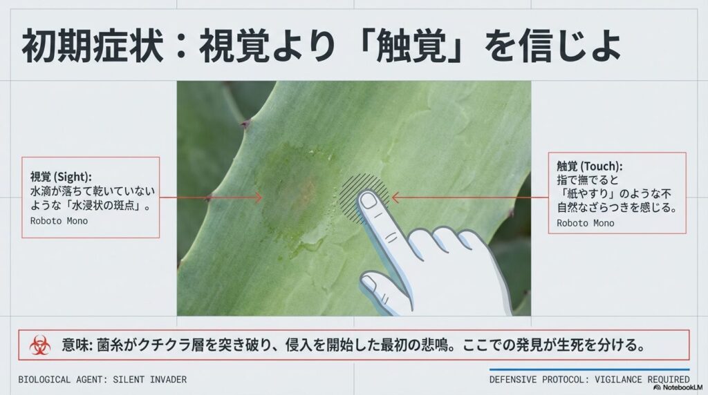視覚だけでなく、指先で撫でた時の「紙やすり」のような不自然なざらつきが、菌糸侵入の最初のサイン(悲鳴)です 。