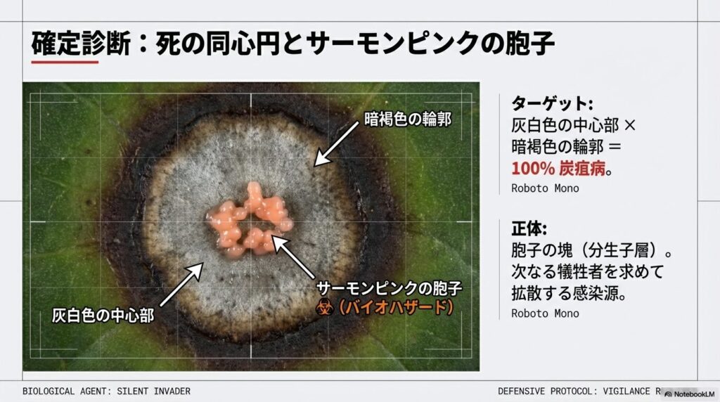 灰白色の中心部と暗褐色の輪郭、そして次なる犠牲者を求めて拡散するサーモンピンクの胞子塊(分生子層)が確認できれば、炭疽病の確定診断となります 。