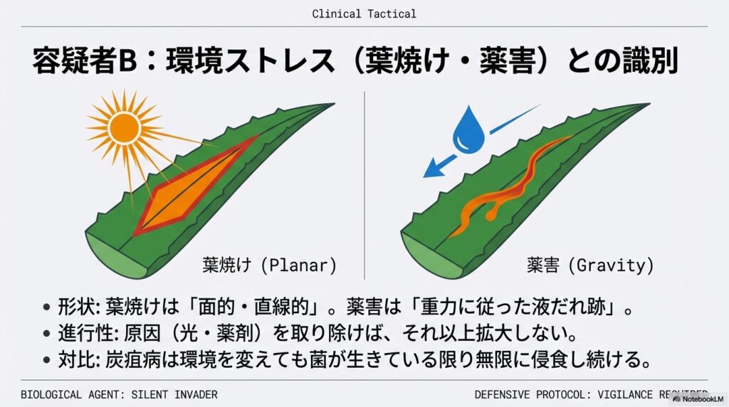 しかし、葉焼けと炭疽病には、原因の根本から異なる決定的な見分け方が存在します。