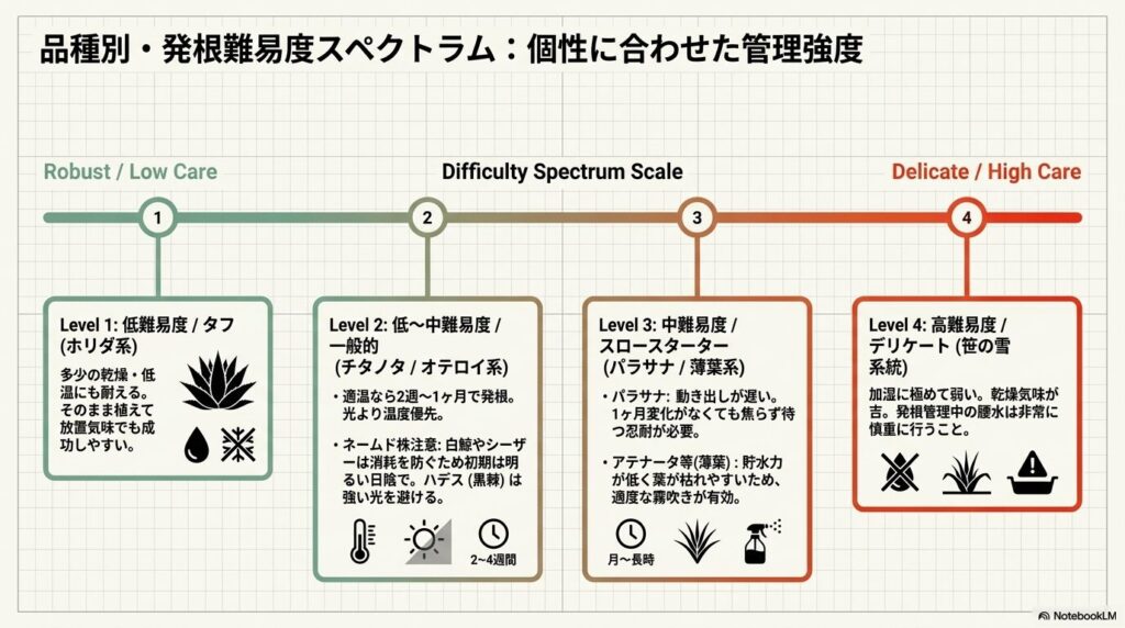 | 薄葉系(アテナータ等) | 中〜高 | 貯水能力が低いため、発根前に葉が枯れやすい。適度な霧吹きが有効。 |