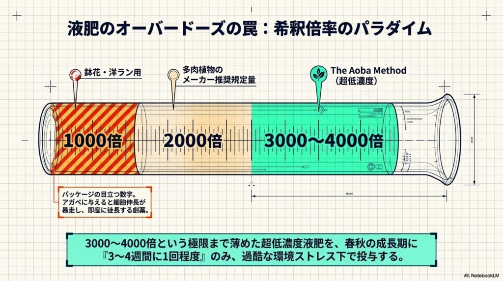 この血の滲むような失敗経験から、私はアガベに液肥を使用する際の厳格なマイルールを定めました。
